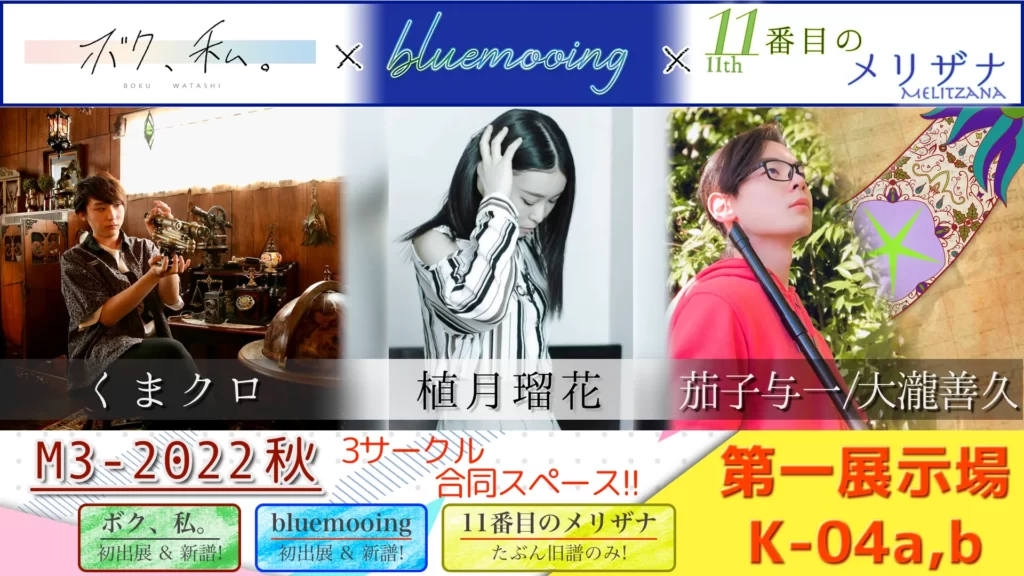 「ボク、私。 」様、「bluemooing」様の頒布作品等につきましては、そちらの告知をご参照ください。